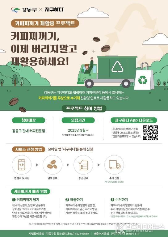 [ 한국미디어뉴스 이보영 기자 ] 강동구는 커피를 추출하고 남은 찌꺼기를 자원으로 되살리는 ‘커피찌꺼기 재활용 캠페인’을 본격적으로 추진한다고 밝혔다. 이를 통해 연간 100톤 이상의 생활폐기물을 감축하고 탄소중립 정책 실현에도 힘을 보탠다는 계획이다.