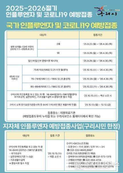 [ 한국미디어뉴스 김서안 기자 ] 구리시는 2025~2026절기 인플루엔자와 코로나19 유행에 대비해 오는 9월 22일부터 2026년 4월 30일까지 관내 110개 위탁의료기관에서 무료 예방접종을 실시한다고 밝혔다.