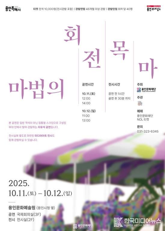 [ 한국미디어뉴스 이원영 기자 ] (재)용인문화재단은 오는 10월 11일과 12일, 용인문화예술원 국제회의실에서 특별한 몰입형 공연 〈마법의 회전목마〉를 선보인다. 티켓은 9월 19일부터 용인문화재단과 NOL티켓에서 예매 가능하며, 용인문화재단의 티켓 할인 이벤트 ‘만원 조아용’ 적용 공연으로 전석 1만원에 판매된다.