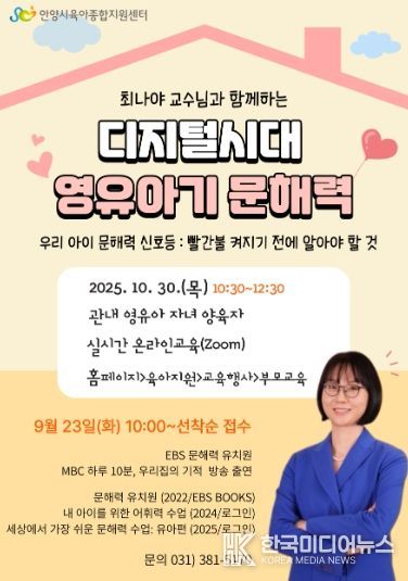 [ 한국미디어뉴스 이보영 기자 ] 안양시가 오는 10월 30일 오전 10시 30분 영유아기의 문해력 발달 중요성과 올바른 양육 방법을 알아보는 양육자 1천명 대상 온라인 부모교육을 개최하고, 이달 23일부터 교육생을 선착순으로 신청받는다고 19일 밝혔다.