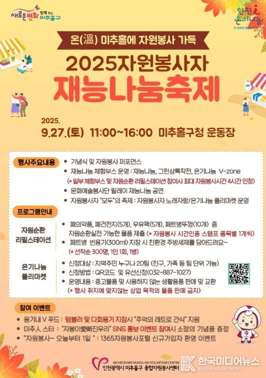 [ 한국미디어뉴스 최치남 기자 ] 인천 미추홀구종합자원봉사센터는 오는 27일 미추홀구청 운동장에서 ‘온(溫) 미추홀에 자원봉사 가득 - 2025 자원봉사자 재능 나눔 축제’를 개최한다.