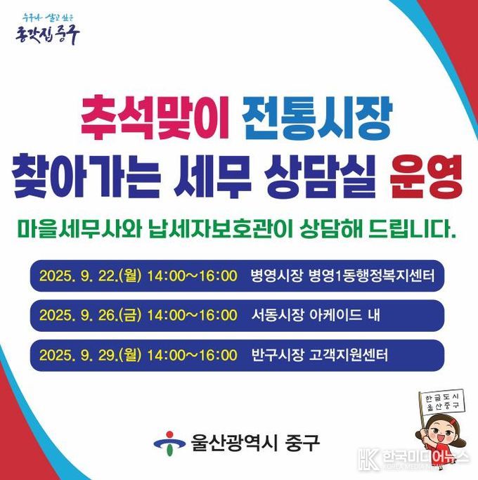 [ 한국미디어뉴스 이보영 기자 ] 울산 중구가 추석 명절을 앞두고 지역 내 전통시장 3곳에서 ‘찾아가는 마을세무사 무료 세무 상담’ 행사를 연다.