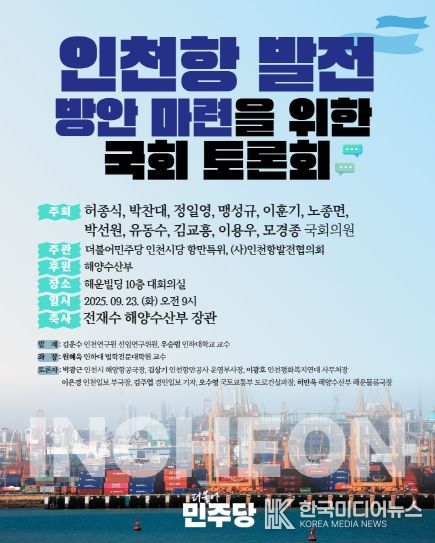 더불어민주당 허종식(인천 동구미추홀구갑) 국회의원은 9월 23일 오전 9시 여의도 해운빌딩 10층 대회의실에서 ‘인천항 발전 방안 마련을 위한 국회 토론회’를 개최한다고 밝혔다.