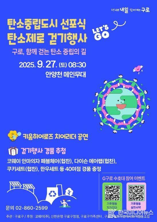 [ 한국미디어뉴스 이보영 기자 ] 구로구가 오는 27일 오전 8시 30분 안양천 구로G페스티벌 메인무대에서 ‘구로, 함께 걷는 탄소중립의 길’을 주제로 ‘탄소중립도시 구로’ 선포식을 개최한다.