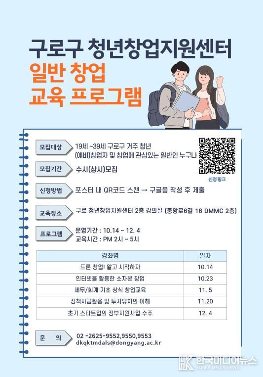 [ 한국미디어뉴스 이보영 기자 ] 구로구가 오는 10월부터 12월까지 청년창업지원센터를 통해 ‘일반 창업교육’과 ‘전문 창업교육’을 운영한다고 밝혔다. 청년의 창업역량 강화를 통해 안정적인 창업 기반을 마련하기 위한 취지다.