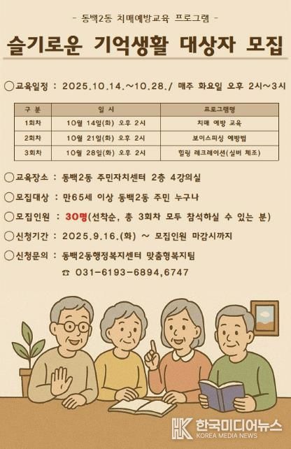 [ 한국미디어뉴스 이원영 기자 ] 용인특례시 기흥구 동백2동은 10월 14일부터 28일까지 3주간 진행하는 치매 예방 프로그램 ‘슬기로운 기억생활’ 참여자를 모집한다고 22일 밝혔다.
