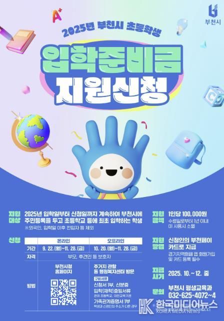 [ 한국미디어뉴스 김만길 기자 ] 부천시는 2025학년도 초등학교에 입학한 신입생을 대상으로, 가정의 교육비 부담을 덜고 원활한 학교생활 적응을 돕기 위해 1인당 10만 원의 입학준비금을 부천페이로 지급한다고 밝혔다.