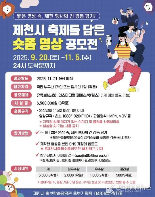 [ 한국미디어뉴스 김풍옥 기자 ] 제천시가 오는 11월 21일까지 '제천시 축제를 담은 숏폼 영상 공모전'을 개최한다.