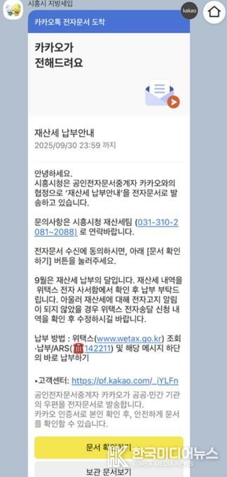 [ 한국미디어뉴스 이보영 기자 ] 시흥시는 시민 편의 증진과 행정 효율성 강화를 위해 카카오톡을 활용한 ‘시세 안내 모바일 전자고지 서비스’를 본격 도입하고, 지난 9월 16일부터 시행에 들어갔다.