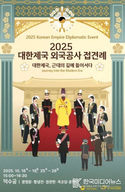[ 한국미디어뉴스 이원영 기자 ] 국가유산청 궁능유적본부는 국가유산진흥원과 함께 10월 18일~19일, 25일~26일 오후 3시 덕수궁(서울 중구)에서 고종 황제가 외국공사를 접견하는 의례와 연회를 재현한 공연 '2025년 대한제국 외국공사 접견례'를 개최한다.