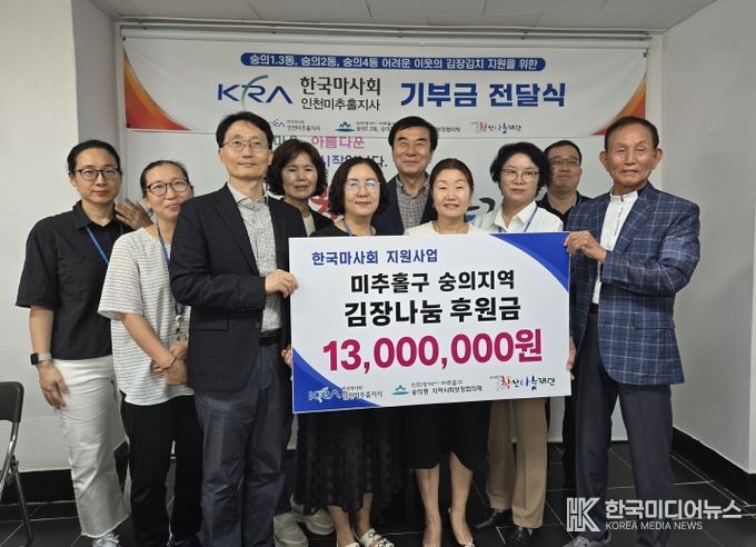 [ 한국미디어뉴스 최치남 기자 ] 한국마사회 인천미추홀지사(지사장 조영진)는 미추홀구 숭의1·3동, 숭의2동, 숭의4동 일대 취약계층을 지원하기 위해 김장 나눔 후원금 1,300만 원을 학산나눔재단에 전달했다고 23일 밝혔다.