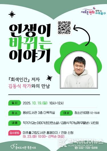 [ 한국미디어뉴스 최치남 기자 ] 인천 미추홀구 용비도서관은 오는 10월 19일 청소년을 위한 특별한 북콘서트 ‘인생이 바뀌는 이야기’를 개최한다.