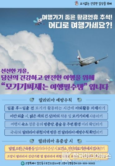 [ 한국미디어뉴스 문상수 기자 ] 고양특례시 일산동구보건소는 긴 추석 황금연휴를 맞이해 가족들과 국내외 여행을 가는 시민들의 말라리아 예방수칙 준수를 당부했다.
