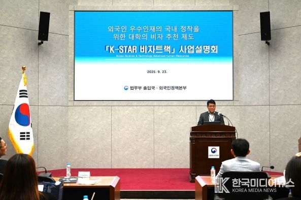 법무부는 9월 23일 'K-STAR 비자트랙'제도의 이해를 돕기 위해 정부과천청사에서 관계부처와 27개 대학을 대상으로 사업설명회를 개최하고, 미래성장동력을 이끌 외국인 우수인재 유치 및 정착 지원을 위한 비자 운영 계획을 소개했다.