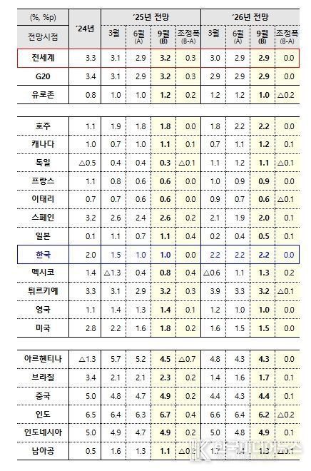 향후 세계경제 성장률은 ’25년 3.2%(’25.6월 전망 대비 +0.3%p), ’26년 2.9%(’25.6월 전망과 동일)를 기록할 것으로 전망했으며, 올해 하반기에는 조기선적 효과가 감소하고 관세 인상과 높은 정책 불확실성이 투자와 무역을 위축시키면서 성장세가 둔화될 것으로 예상했다.