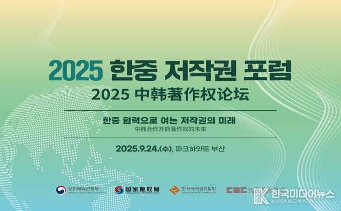 [ 한국미디어뉴스 이원영 기자 ] 문화체육관광부는 한국저작권위원회, 중국 국가판권국과 함께 9월 24일, 파크하얏트 부산에서 ‘2025 한중 저작권 정부간회의(오전)’와 ‘2025 한중 저작권 포럼(오후)’을 열어 저작권 보호를 위한 양국 협력 방안과 인공지능(AI), 블록체인 등 기술 발전에 따른 저작권 정책 변화 및 대응을 논의한다.