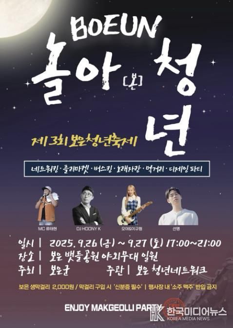 26일 개막식에는 ‘청년이 살기 좋은 보은군’을 알리는 개막 퍼포먼스가 펼쳐져 지역 청년들의 자신감을 대외적으로 드러낼 계획이다. 이어 버스킹 무대와 EDM 파티, 보은 전통주와 막걸리 파티를 열며 지역 농산물과 청년 문화의 만남을 통해 지역경제와 문화를 잇는 상징적 자리가 될 전망이다.
