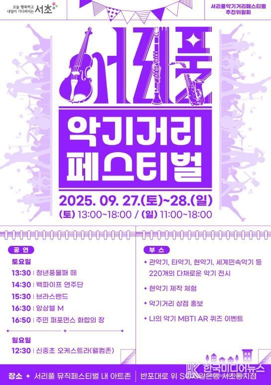 [ 한국미디어뉴스 이보영 기자 ] 서울 서초구는 '2025 서리풀뮤직페스티벌' 기간인 오는 27일부터 28일까지 반포대로 일대에서 ‘제7회 서리풀 악기거리 축제’를 개최한다고 밝혔다. ‘서리풀 악기거리 축제 추진단’이 주최·주관하는 이번 축제는 국내 유일 음악문화지구인 서리풀 악기거리에서 구의 악기거리 인프라를 활용해 모두가 함께 만들어 가는 문화축제다.