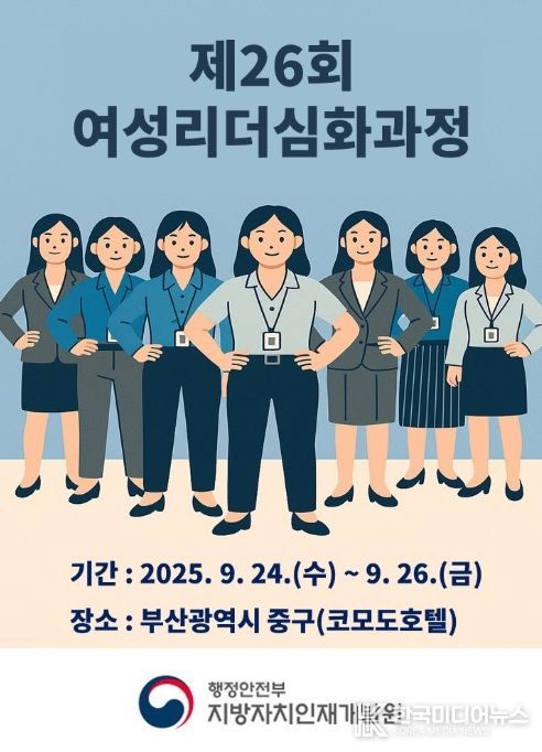 [ 한국미디어뉴스 이원영 기자 ] 행정안전부 지방자치인재개발원은 9월 24일부터 9월 26일까지 부산광역시에서 지방자치단체 여성공무원 200여 명을 대상으로 ‘제26회 여성리더심화과정’을 운영한다고 밝혔다.