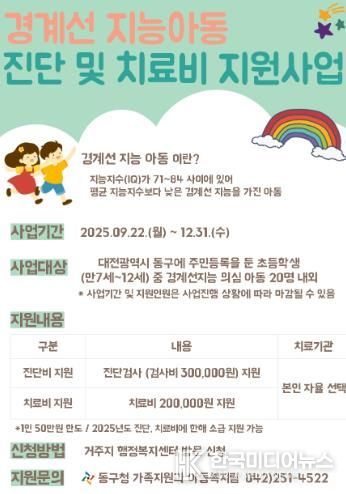지원 대상은 동구에 주소를 둔 초등학생(만 7~12세) 중 경계선지능 의심 아동 20명 내외이며, 사업 기간은 2025년 12월 31일까지다.
