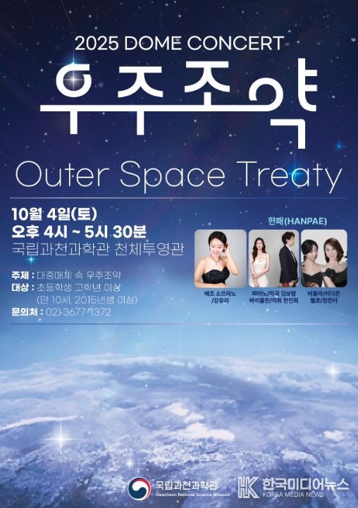 [ 한국미디어뉴스 이원영 기자 ] 과학기술정보통신부 국립과천과학관은 세계 우주 주간을 맞아 오는 10월 4일 오후 4시, 천체투영관에서 돔 토크 콘서트 '대중매체 속 우주 조약'을 개최한다고 밝혔다.