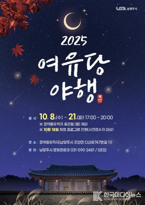 [ 한국미디어뉴스 김서안 기자 ] 남양주시는 오는 10월 8일부터 21일까지 조안면 정약용유적지에서 야간 문화행사 ‘2025 여유당 야행’을 개최하고, 특별 기획 프로그램인 ‘여유당 별빛산책’ 참가자 사전 접수를 24일부터 시작한다.