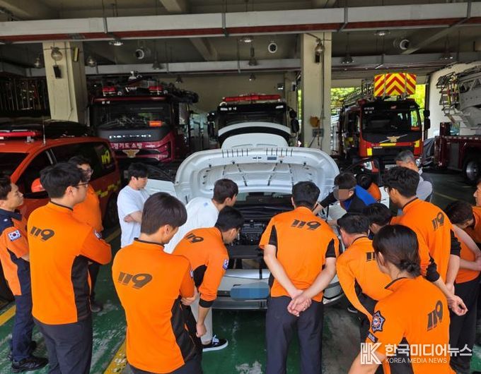 이번 교육에는 119안전센터, 구조대 등 소방서 직원 40여 명이 참여했으며, 현대자동차 북부하이테크센터 전문 강사가 직접 방문해 이론과 실습을 병행한 맞춤형 교육을 진행했다. 이론 과정에서는 친환경차 구조 이해, 전기·수소차 식별법, 고전압 안전장치와 응급조치 요령 등을 다뤘으며, 실습 과정에서는 전기차 구조 작업, 고전압 시스템 비활성화, 사고 차량 지지 및 방전 차량 문 개방 방법 등을 집중 훈련했다.