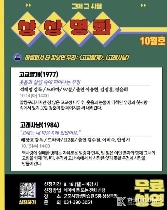 [ 한국미디어뉴스 이보영 기자 ] 군포문화재단 군포시평생학습원은 시민들의 문화 향유와 세대 공감을 위해 오는 10월 14일과 15일 상상극장에서 고전 영화 상영 프로그램 〈상상명화〉를 운영한다. 이번 상영작은 ‘고교얄개’와 ‘고래사냥’으로 무료 상영된다.
