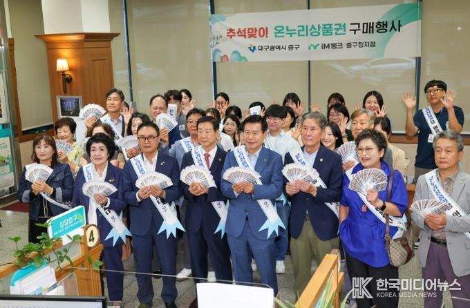 [ 한국미디어뉴스 이보영 기자 ] 대구 중구는 추석 명절을 앞둔 24일 아이엠뱅크(구 대구은행) 중구청 지점에서 전통시장 상인회장, 각급 협의단체장, 구의원 등이 함께 침체한 전통시장 활성화를 위한 ‘추석 맞이 온누리상품권 구매 행사’를 개최했다.