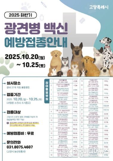 [ 한국미디어뉴스 문상수 기자 ] 고양특례시는 2025년 하반기 광견병 예방접종을 10월 20일부터 실시한다고 밝혔다.