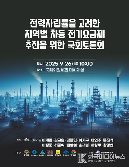 [ 한국미디어뉴스 이원영 기자 ] 이재관 의원(충남 천안을·더불어민주당)은 오는 26일 10시 국회의원회관 대회의실에서 이재관, 김교흥, 김종민, 어기구, 이언주, 문진석, 이정문, 허종식, 권향엽, 송재봉, 허성무, 황명선 국회의원이 공동주최하고 충청남도, 인천광역시, 울산광역시, 강원특별자치도, 전라남도, 경상북도, 경상남도가 공동주관하는 '전력자립률을 고려한 지역별 차등 전기요금제 추진을 위한 국회 토론회'를 개최한다고 밝혔다.