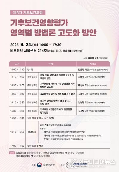 [ 한국미디어뉴스 이원영 기자 ] 질병관리청은 대한예방의학회(회장 홍영습)와 함께 '3차 기후보건포럼'을 9월 24일 오후 2시, 비즈허브 서울센터(서울시 중구 소재)에서 개최한다.