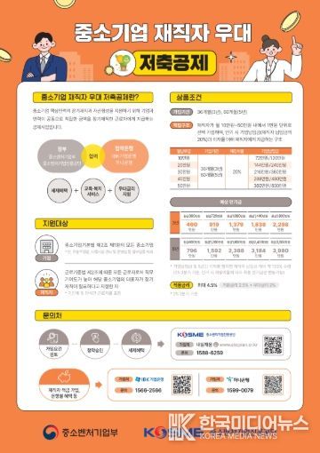 [ 한국미디어뉴스 이원영 기자 ] 중소벤처기업부와 IBK기업은행, 하나은행은 중소기업과 재직자로부터 많은 호응을 받고있는'중소기업 재직자 우대 저축공제(이하 우대 저축공제)'의 상품 선택의 폭을 확대하기 위해 기존 5년형 상품에 3년형 상품을 추가 출시하여 9월 25일부터 가입이 가능하다고 밝혔다.