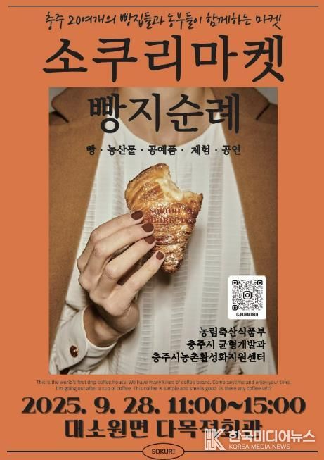 [ 한국미디어뉴스 김풍옥 기자 ] 충주시농촌활성화지원센터는 오는 9월 28일 오전 11시부터 오후 3시까지 대소원면 다목적회관 광장에서 두 번째 ‘소쿠리마켓 빵지순례’를 개최한다고 밝혔다.
