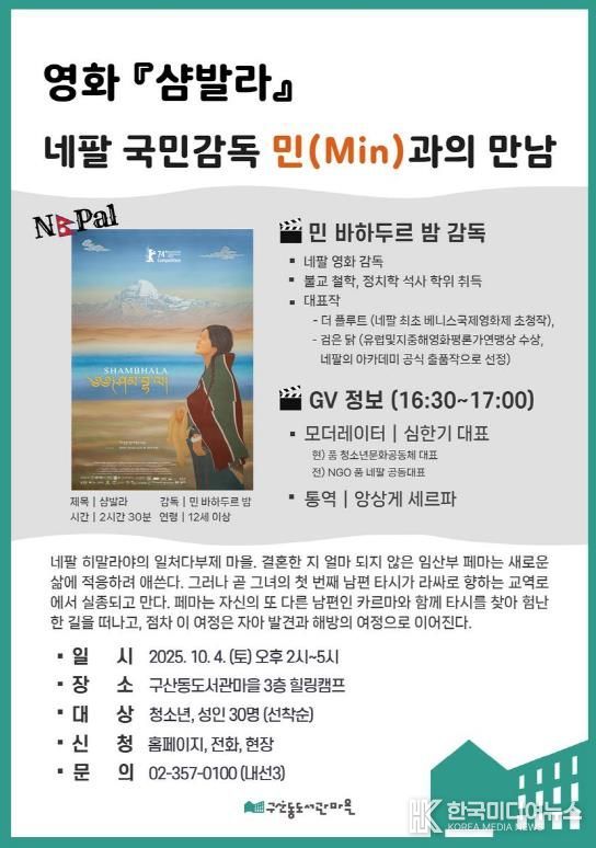 [ 한국미디어뉴스 이보영 기자 ] 서울 은평구는 내달 4일 오후 2시 영화 ’샴발라‘의 감독이자 네팔의 국민감독 민(Min)과의 만남을 구산동도서관마을에서 개최한다고 밝혔다.