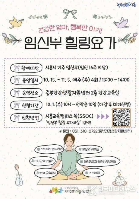 요가 교실은 매주 수요일 오후 1시부터 2시까지 중부건강생활지원센터 2층 건강교육실에서 진행된다. 참여 희망자는 10월 1일부터 시흥교육캠퍼스 쏙(SSOC)을 통해 무료로 신청할 수 있으며, 모집 마감 후에는 대기 신청도 가능하다.