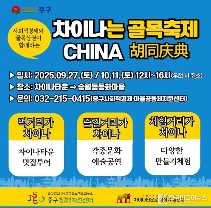 [ 한국미디어뉴스 최치남 기자 ] 인천 중구 사회적경제·마을공동체 지원센터는 올해 9월부터 11월까지 인천 차이나타운·동화마을 일원에서 ‘2025년도 사회적경제와 골목상권이 함께하는 '차이나는 골목축제'’를 개최한다고 25일 밝혔다.