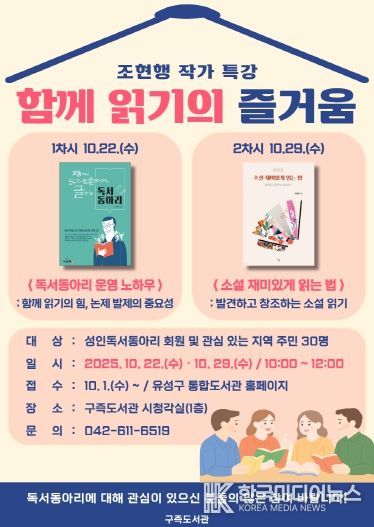 [ 한국미디어뉴스 이보영 기자 ] 대전 유성구는 10월 22일과 29일 이틀간 구즉도서관에서 문학칼럼니스트 조현행 작가를 초청해 ‘함께 읽기의 즐거움’ 특강을 개최한다.