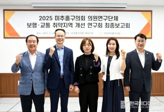 [ 한국미디어뉴스 최치남 기자 ] 인천광역시 미추홀구의회 의원연구단체 '보행·교통 취약지역 개선 연구회'(대표의원 박수연, 연구의원 장규철·배상록·김태계)가 2025년 9월 24일 미추홀구의회 세미나실에서 연구용역 최종보고회를 개최하고 성공적으로 마무리했다.