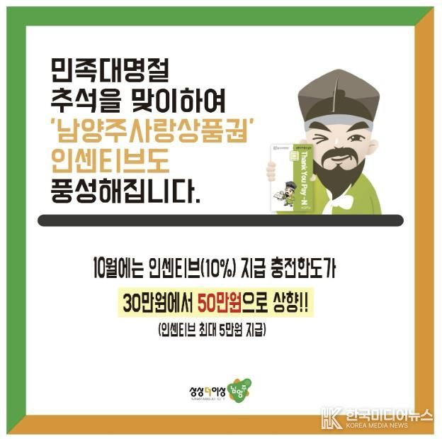 [ 한국미디어뉴스 김서안 기자 ] 남양주시는 추석을 맞아 위축된 소비심리 회복과 지역 내 소비 촉진을 위해 10월 한 달간 남양주사랑상품권 인센티브 충전 한도를 기존 월 30만 원에서 50만 원으로 상향한다고 25일 밝혔다.