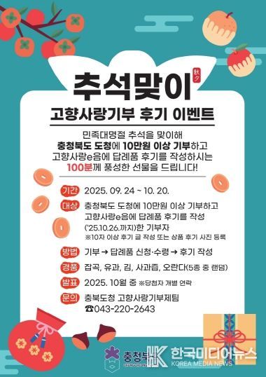 [ 한국미디어뉴스 김풍옥 기자 ] 충북도는 다가오는 추석을 맞아 지역사랑과 나눔 문화를 확산하기 위해 ‘고향사랑기부제’ 특별 이벤트를 9월 24일부터 10월 20일까지 진행한다.