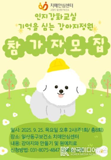 [ 한국미디어뉴스 문상수 기자 ] 고양특례시 일산동구보건소 치매안심센터는 원예치료 및 동물매개치료를 적용한 인지강화교실 ‘기억을 심는 강아지정원’에 참여할 참가자를 모집한다고 25일 밝혔다.