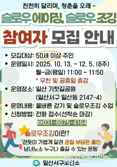 [ 한국미디어뉴스 문상수 기자 ] 고양특례시 일산서구보건소는 10월 13일부터 12월 5일까지(8주간) 진행되는 ‘슬로우에이징·슬로우조깅’ 프로그램 참여자를 모집한다고 밝혔다.
