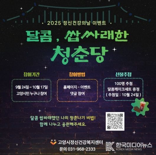 [ 한국미디어뉴스 문상수 기자 ] 고양시정신건강복지센터 초발정신건강사업팀은 10월 10일 정신건강의 날을 기념해 고양시민 및 청년을 대상으로 ‘달콤, 쌉싸래한 청춘당’ 온라인 캠페인을 10월 17일까지 진행한다.