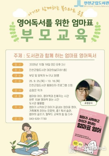 특강은 오는 10월 18일 오후 2시 진천군립도서관 대강의실에서 진행될 예정이며, 부모와 영어책 읽기에 관심이 있는 진천군민 누구나 신청할 수 있다.