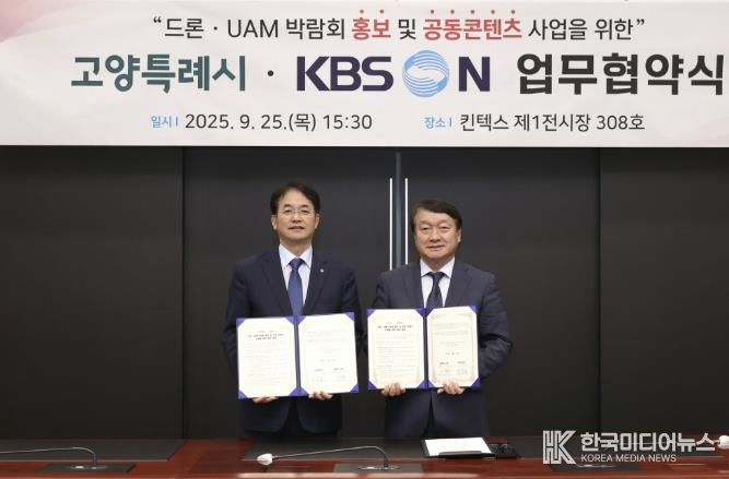 [ 한국미디어뉴스 문상수 기자 ] 고양특례시는 지난 25일 고양 킨텍스에서 KBS N과‘드론·도심항공모빌리티(UAM) 박람회 홍보 및 공동 콘텐츠 사업을 위한 업무협약(MOU)’을 체결했다고 밝혔다.