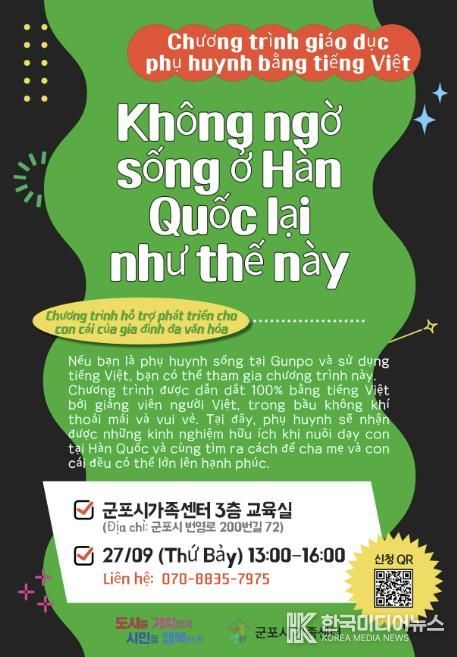 군포시가족센터 관계자는 “이번 부모교육은 베트남 부모님들이 모국어로 자녀 양육의 고민을 나누고, 존중하는 양육 방법을 함께 모색할 수 있다는 점에서 의미가 크다”며 “앞으로도 다양한 문화적 배경을 고려한 맞춤형 부모교육을 확대해 나갈 것”이라고 전했다.