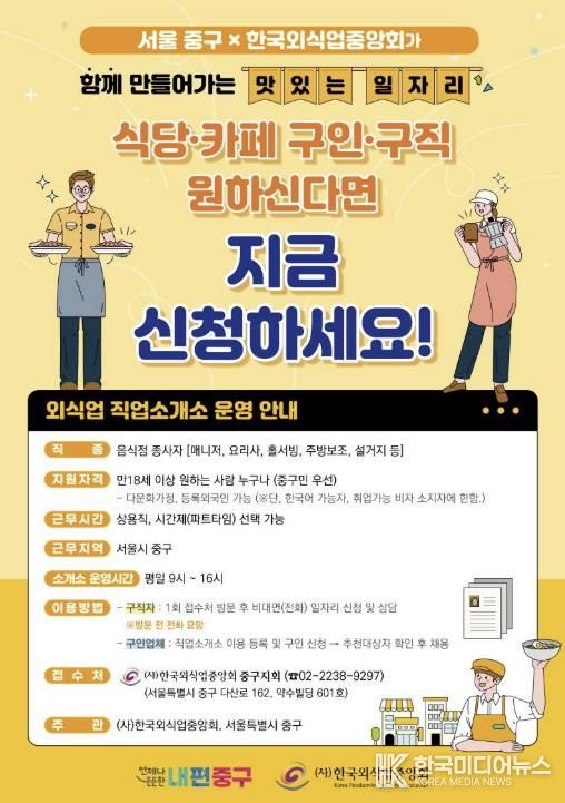 한편, 구는 이와 함께 한국외식업중앙회와 협업으로 '맛있는 일자리, 외식업 구인·구직 연계 사업'을 운영해 음식점 종사자를 원하는 구직자와 인력을 구하는 업체 간 연결고리를 마련한다. 이 사업은 서울시 중구 소재 외식 업체를 대상으로 하며, 매니저·요리사·홀서빙·주방보조 등 직종도 다양하다. 만 18세 이상이면 누구나 신청할 수 있으며, 다문화가정 및 외국인도 한국어 구사와 취업 가능 비자를 갖추면 참여 가능하다.