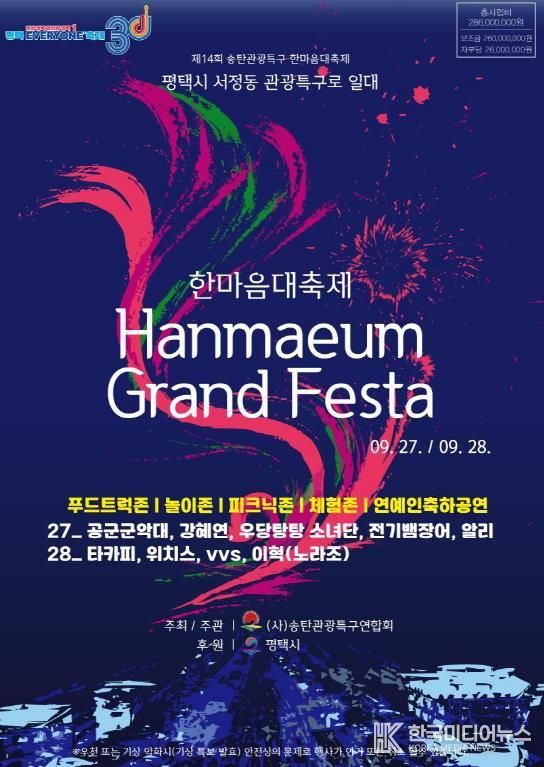 [ 한국미디어뉴스 이보영 기자 ] 사단법인 송탄관광특구연합회가 주최·주관하는 ‘제14회 송탄관광특구 한마음대축제’가 오는 27일(토)과 28일(일) 양일간 송탄출장소 앞 송탄관광특구 일대에서 성대하게 열린다.