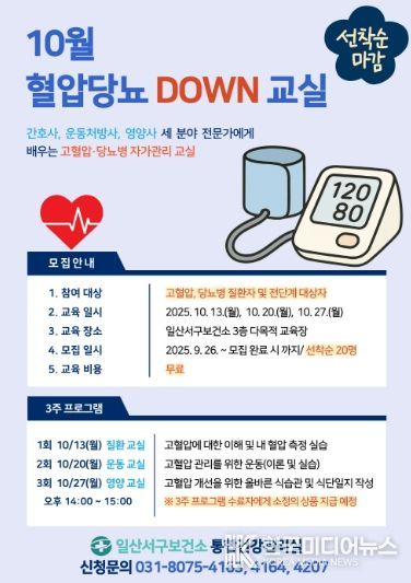 [ 한국미디어뉴스 문상수 기자 ] 고양특례시 일산서구보건소는 10월‘혈압당뇨 DOWN 교실’에 참여할 대상자를 모집한다.